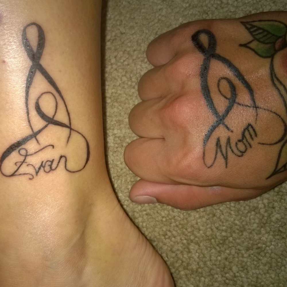 These matching tattoos depict a stylized treble clef symbol, likely representing a shared love for music between the mother and son. The treble clef is universally recognized as a symbol of musical notation, making it a meaningful choice for those who have a deep connection to music. The simplicity of the design adds a touch of elegance, while the placement on the wrist makes it a constant reminder of their bond and shared passion. This tattoo serves as a beautiful expression of their mutual love for music and each other.