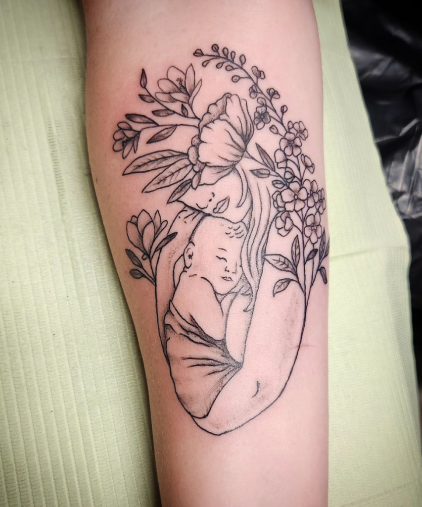 The clean, simple lines make this tattoo elegant and timeless, perfectly capturing the beauty of motherhood and the innocence of childhood in a meaningful and personal way.