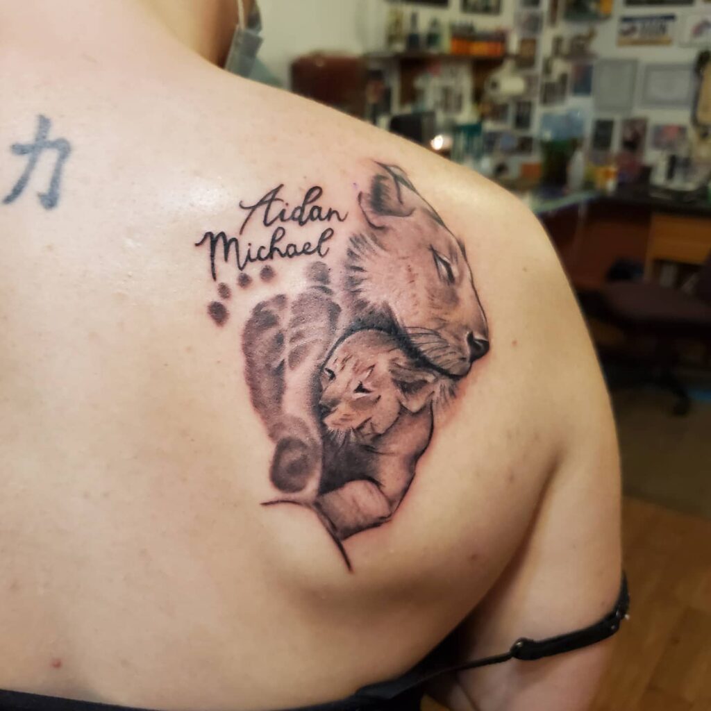 This powerful tattoo features a lioness cradling her cub, symbolizing a fierce, protective maternal bond. The detailed shading adds depth to the design, highlighting the tenderness between the two animals. The names appear above the image, personalized to represent the wearer’s connection to a child.