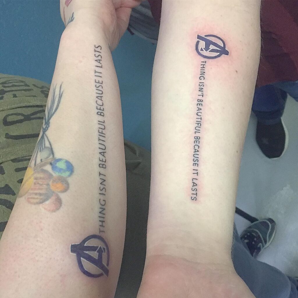These matching tattoos feature the iconic Avengers logo alongside the meaningful quote, “A thing isn’t beautiful because it lasts.” The design, shared between two individuals, celebrates the emotional impact of cherished moments, despite their fleeting nature.