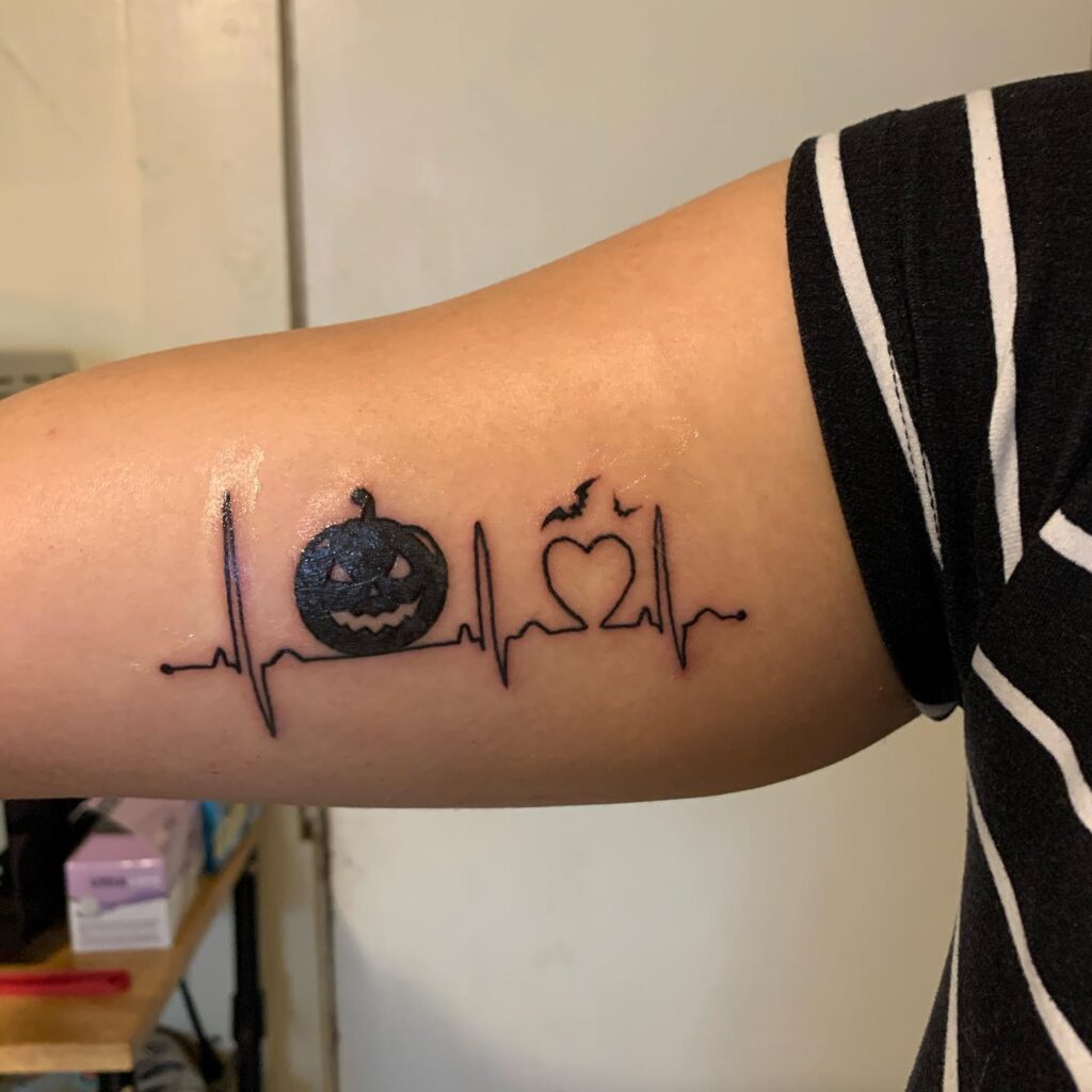 This Halloween tattoo creatively blends spooky imagery with a heartbeat line for a unique, personal design. A carved jack-o’-lantern sits at the center, its mischievous grin glowing with eerie charm.