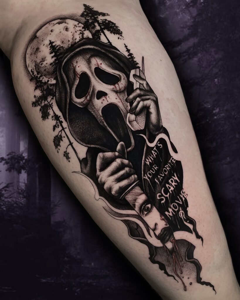This Halloween tattoo delivers a chilling tribute to the iconic Ghostface killer from the Scream movies.