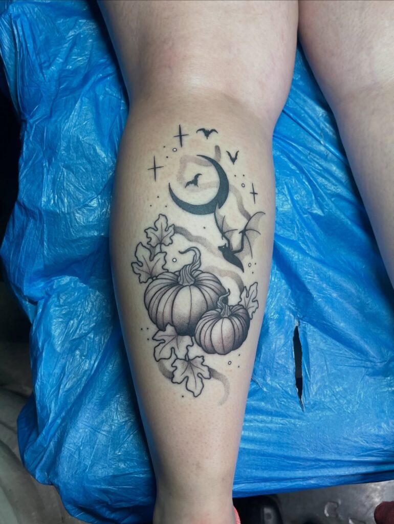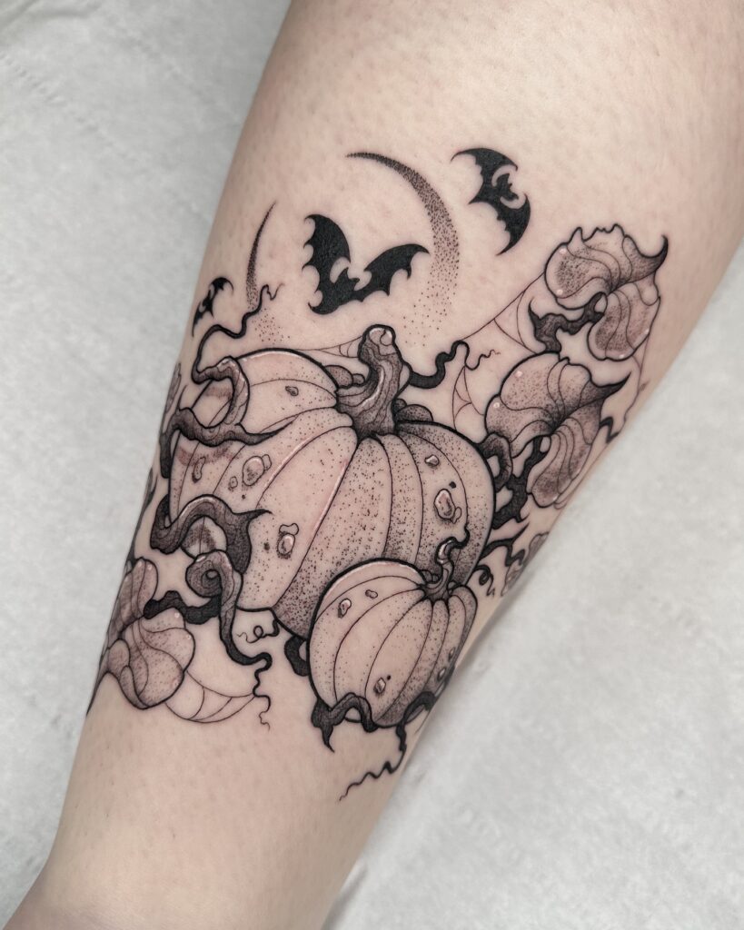 This Halloween tattoo features a beautifully shaded pumpkin patch with twisting vines, delicate textures, and detailed linework. A crescent moon hangs above, surrounded by fluttering bats that add a sense of movement and mystery.