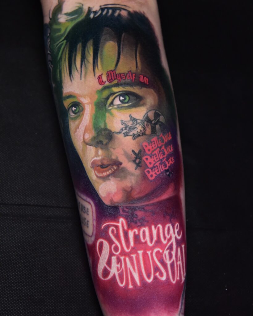 With sharp detail and a cinematic feel, this tattoo perfectly honors Lydia’s dark, whimsical charm and the cult-classic film’s spooky aesthetic.