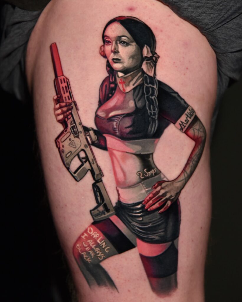 This Halloween tattoo reimagines Wednesday Addams in a bold, modern pin-up style. She’s depicted with her signature braids and stoic expression, but here she holds a detailed rifle, blending gothic charm with rebellious edge.