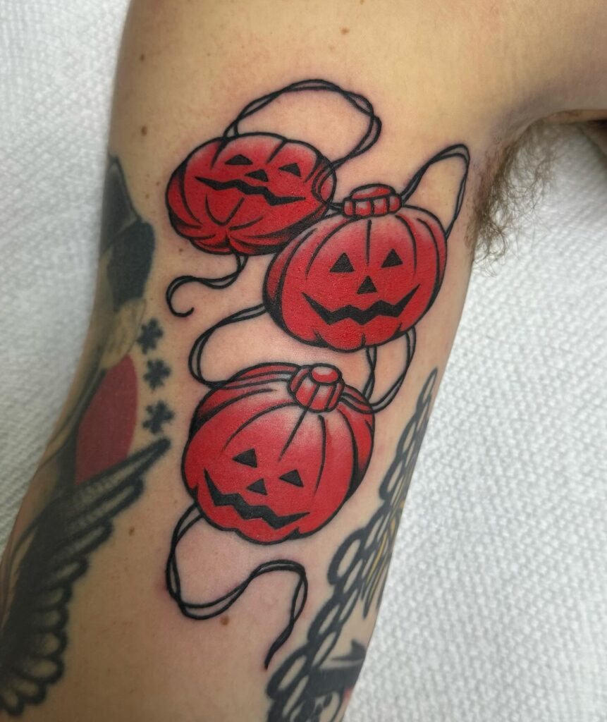 This Halloween tattoo features three vibrant jack-o’-lanterns designed as lanterns, strung together with flowing cords.