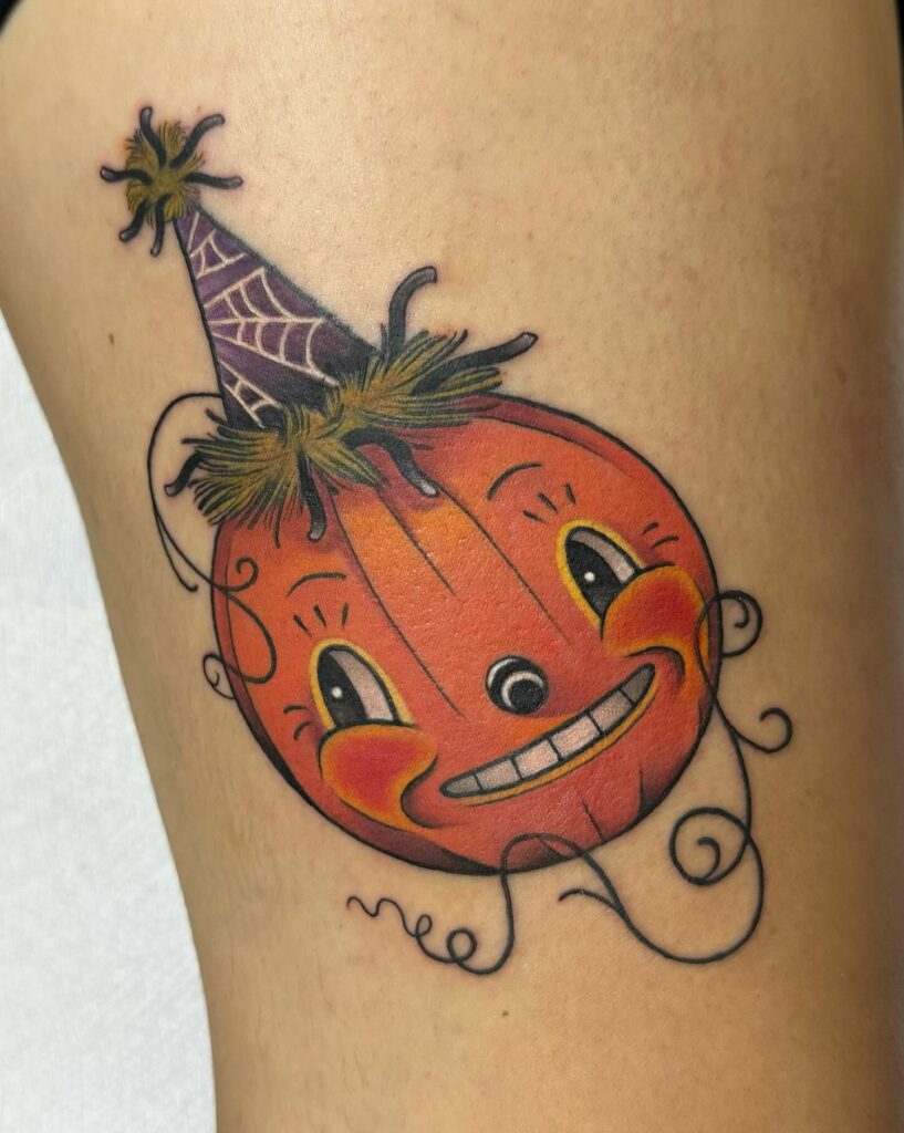 This Halloween tattoo embraces a playful, vintage-inspired style with a smiling jack-o’-lantern face full of personality.