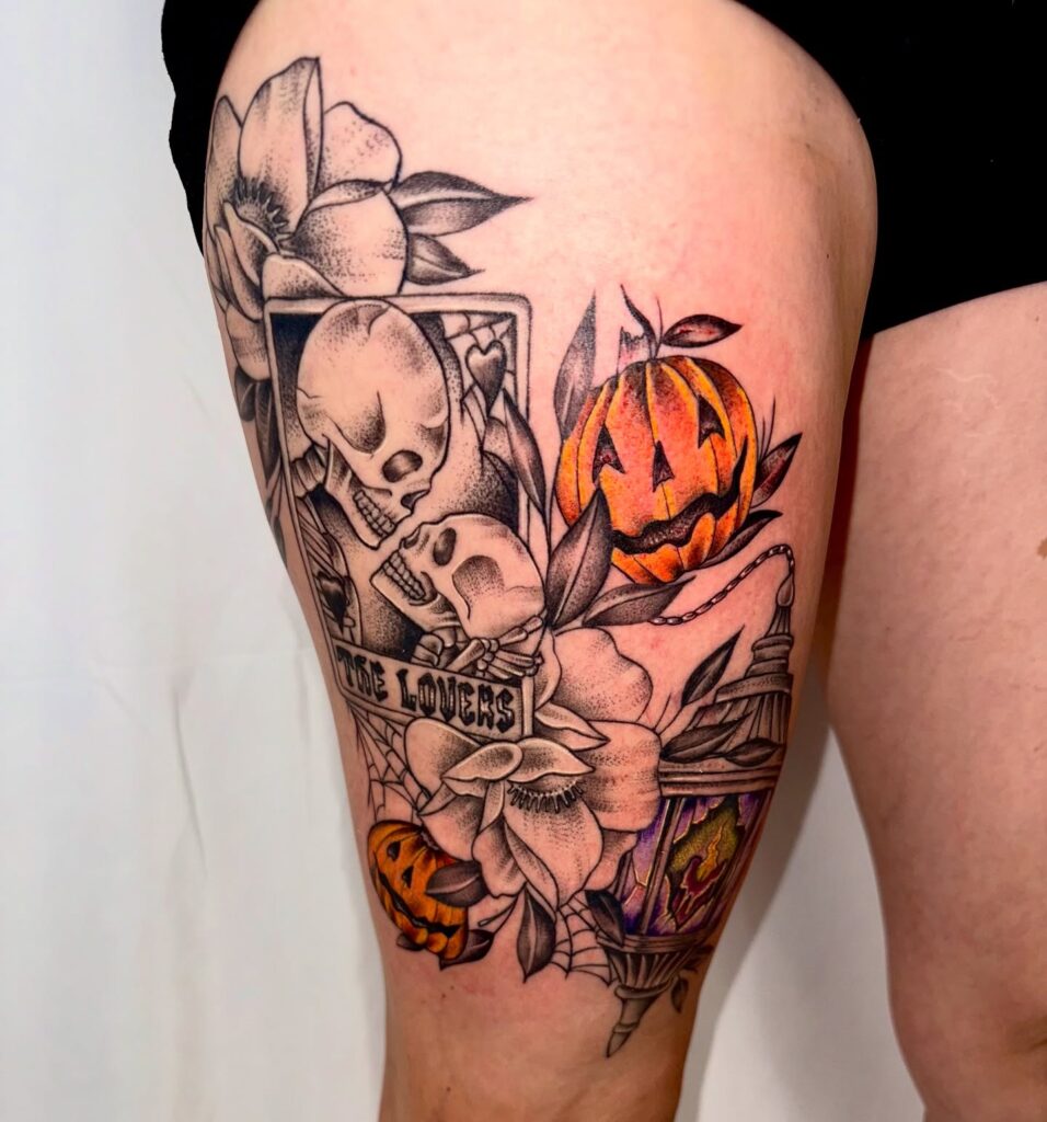 This striking tattoo blends gothic romance with Halloween elements through the imagery of a tarot card. At the center, two skeletal lovers embrace within “The Lovers” card, symbolizing eternal connection even in death.