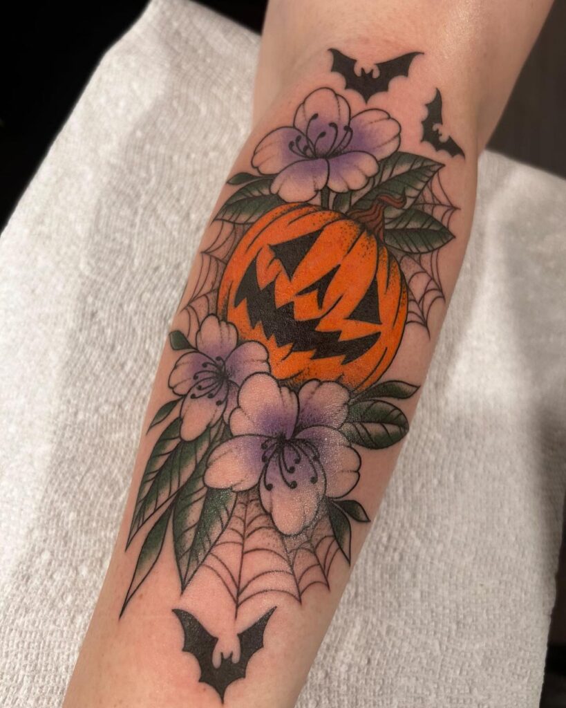 This vibrant Halloween tattoo blends spooky charm with floral beauty. At its center sits a glowing orange jack-o’-lantern, carved with a wicked grin that instantly catches attention.