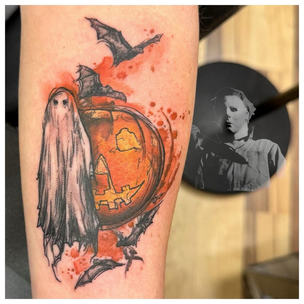 This Halloween tattoo powerfully depicts Michael Myers, the iconic slasher from the Halloween franchise, in haunting realism. His blank mask dominates the design, surrounded by fiery orange accents that amplify the terror.