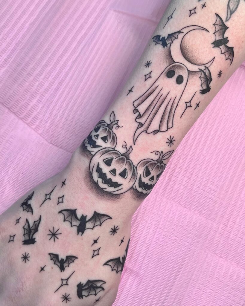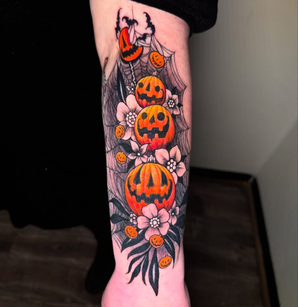 This tattoo perfectly captures the festive spirit of Halloween nights filled with glowing pumpkins and spooky fun.