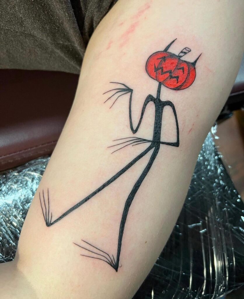 This Halloween tattoo features a thin, stick-like figure with exaggerated limbs and sharp, jagged hands. Its head is a bold red jack-o’-lantern carved with zigzag eyes and a mischievous grin, adding a playful eeriness.