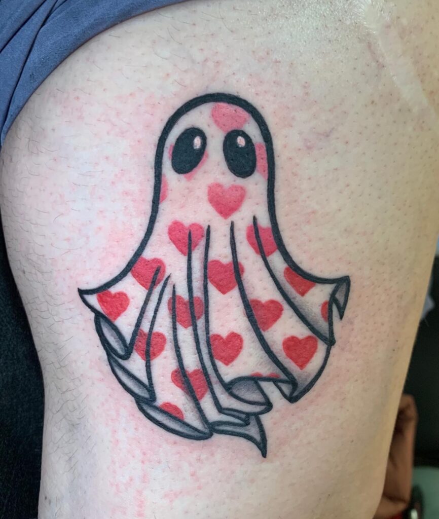 Perfect for those who love mixing cute and spooky themes, this tattoo celebrates ghostly charm with a vibrant, heart-filled twist.