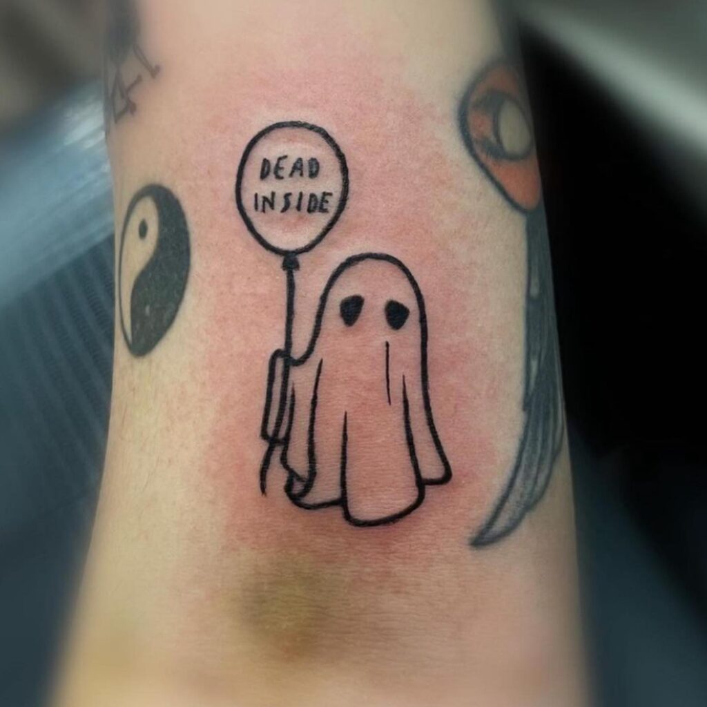This tattoo features a small ghost holding a balloon with the words “Dead Inside” written across it. The ghost’s simple sheet-like form and hollow black eyes give it a classic yet lighthearted appearance.