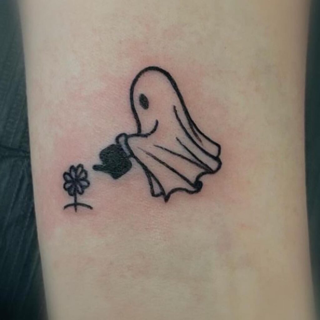 This sweet tattoo shows a tiny ghost holding a watering can, gently nurturing a small flower below. The simple black linework gives the design a clean, minimal appearance, making it easy to love at first glance.