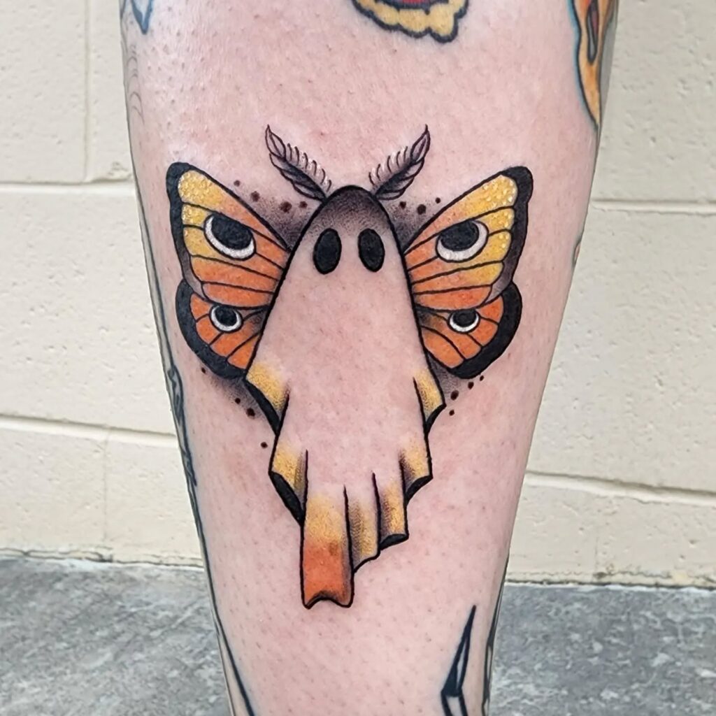 This creative tattoo blends a ghost with the wings of a moth, creating a unique and striking hybrid design. The ghost’s sheet-like body forms the center, with dark eye holes giving it a classic spooky look.