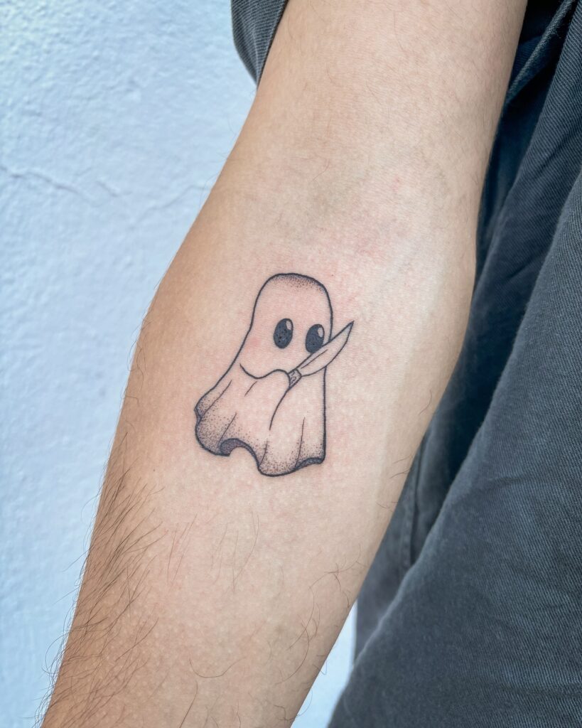 This tattoo features a small ghost with wide, dark eyes, holding a knife in its tiny hands. Despite the weapon, its round shape and simple design give it a cute, almost innocent appearance.