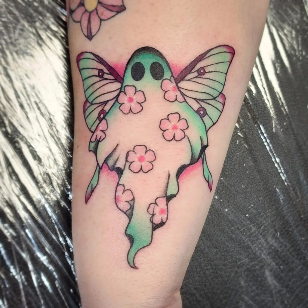 This tattoo blends a ghostly figure with delicate moth-like wings, creating a dreamy and mystical design. The ghost’s body is shaded in soft green tones, decorated with pink blossoms that add sweetness and charm.