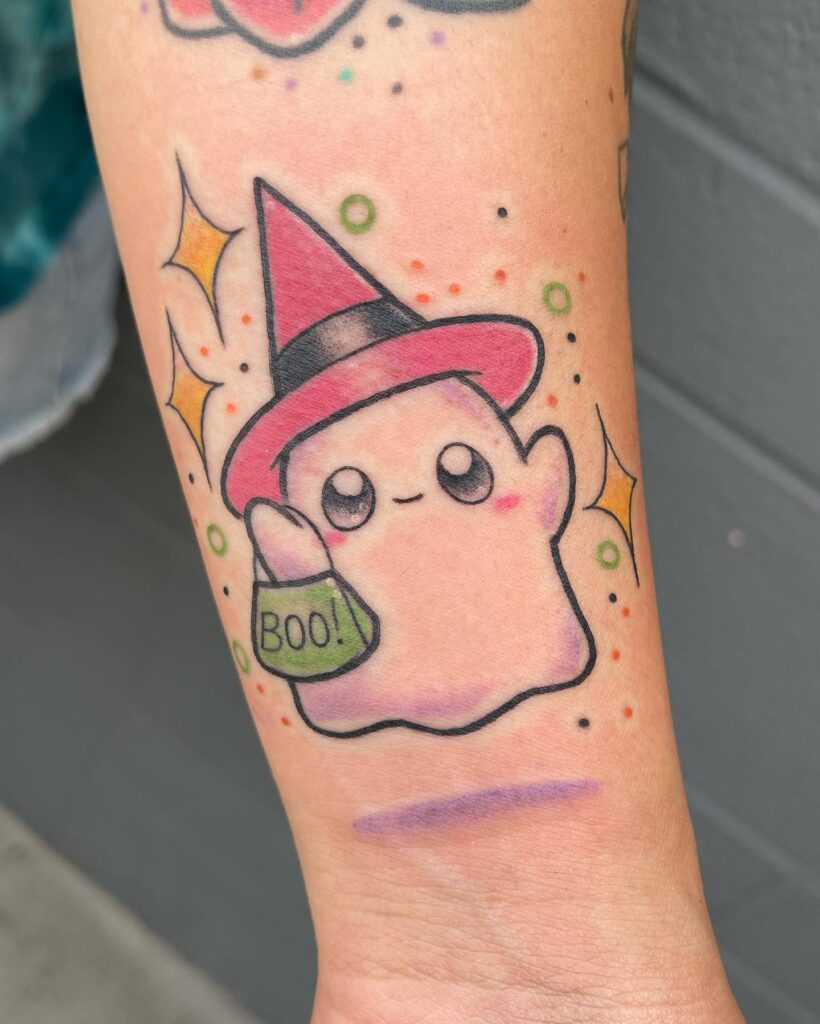 This tattoo features an adorable ghost with big, sparkling eyes, blushing cheeks, and a playful expression. It wears a bright pink witch hat, adding a magical and festive Halloween touch.