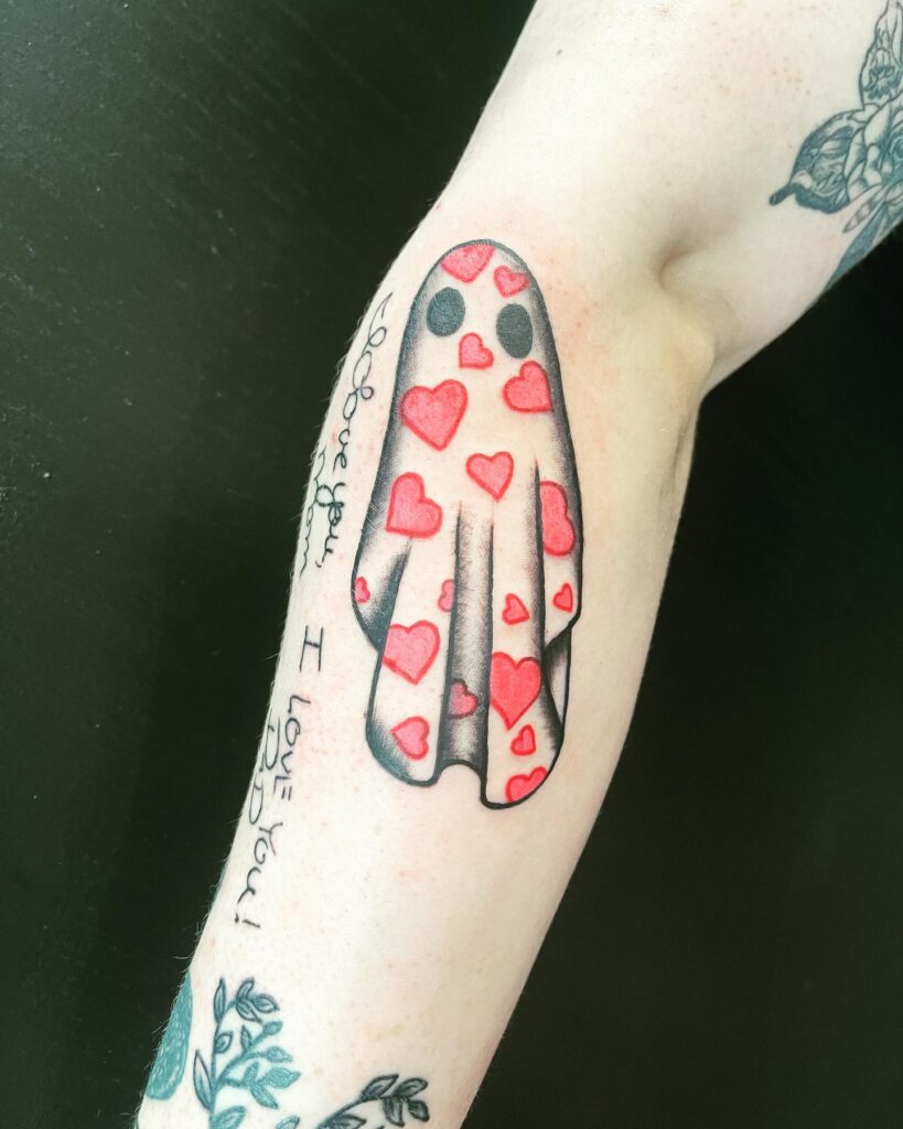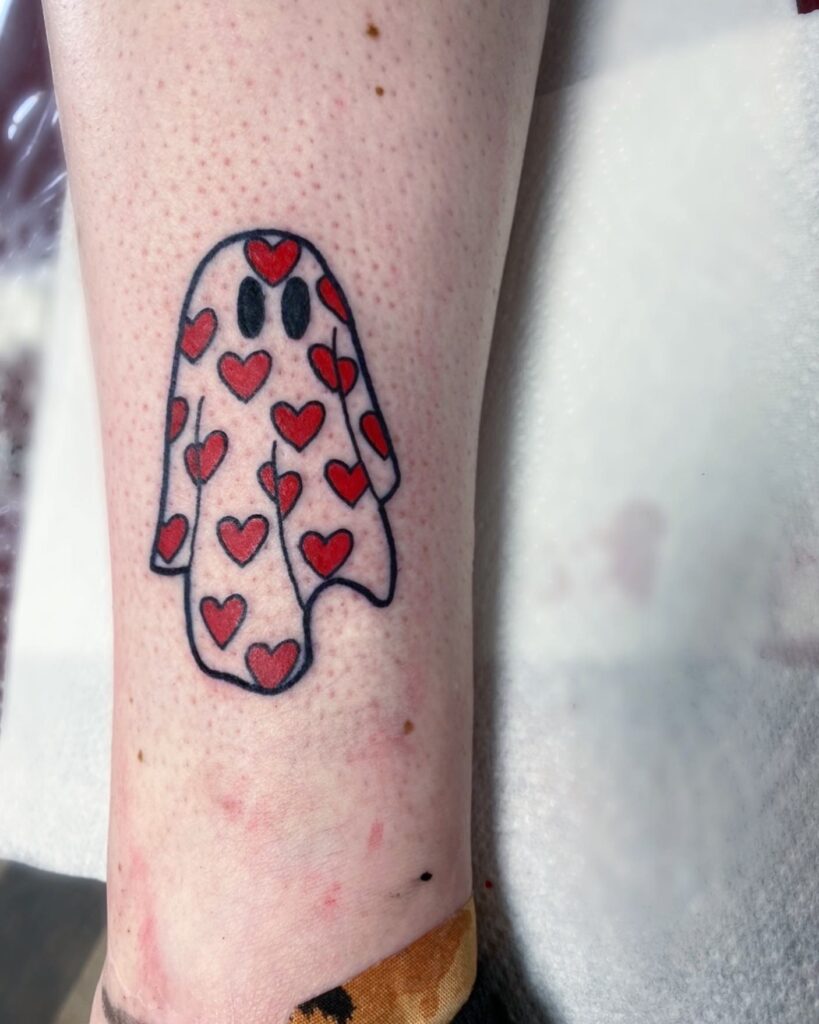 This adorable tattoo showcases a smiling ghost draped in a sheet decorated with bright red hearts. The playful pattern gives the design a warm, affectionate feel while still keeping its spooky charm.
