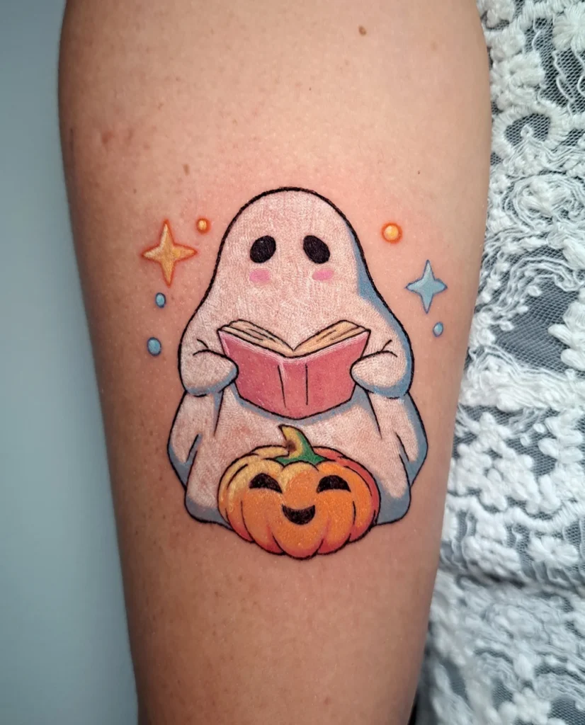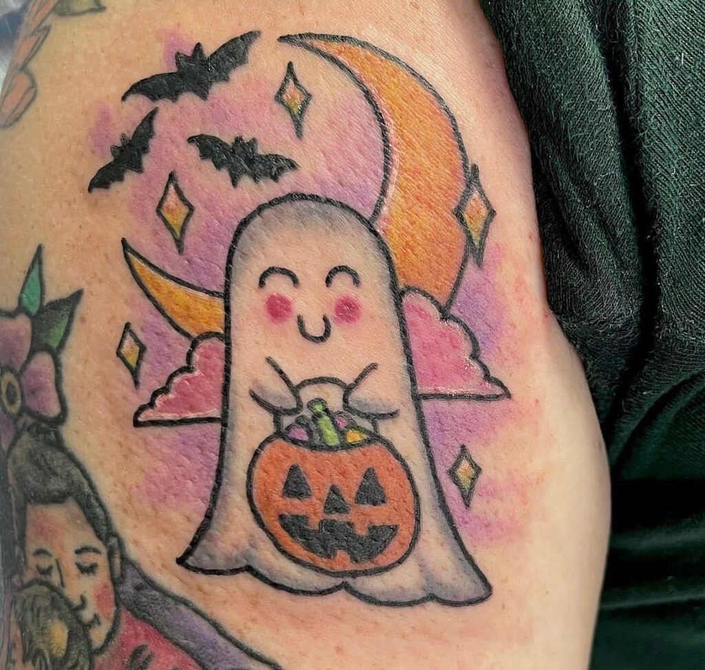 This colorful tattoo features a ghost holding a grinning jack-o’-lantern, blending spooky and cheerful vibes perfectly.