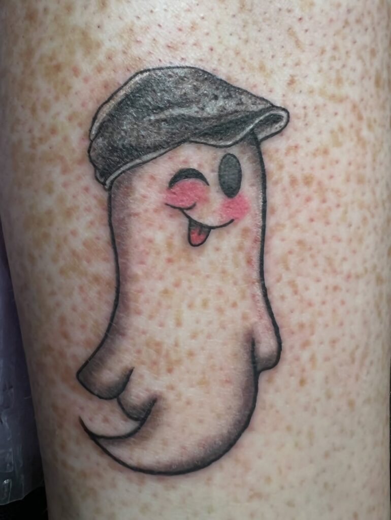 This tattoo features a smiling ghost with a small heart-and-arrow tattoo on its chest, adding a playful twist.