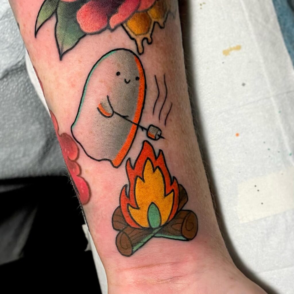 This cheerful tattoo shows a cute ghost roasting a marshmallow over a bright campfire, mixing spooky fun with coziness.