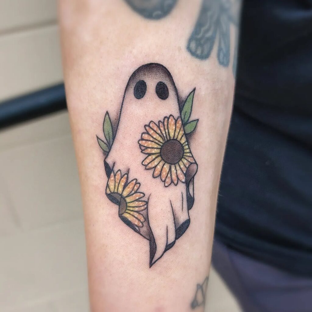 This tattoo features a ghost wrapped in vibrant sunflowers, blending spooky charm with the warmth of nature.