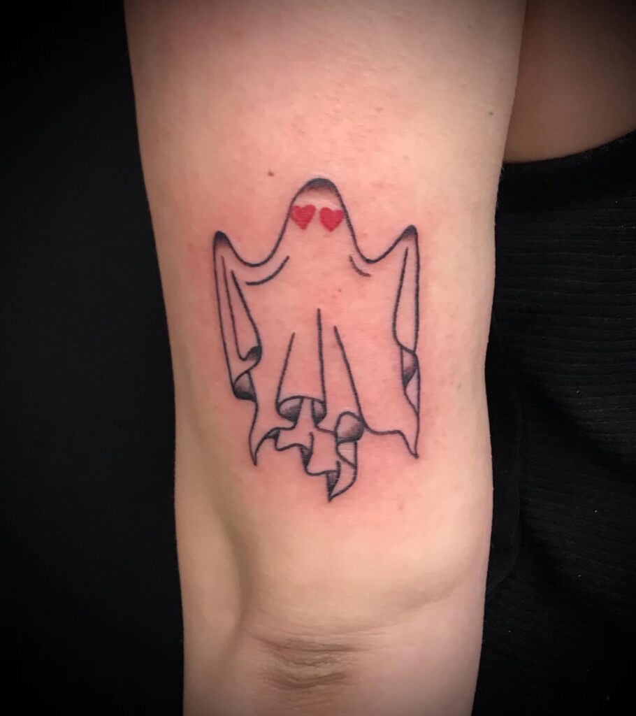 This tattoo features a ghost draped in a flowing sheet decorated with small black hearts, adding a loving twist to the spooky theme.