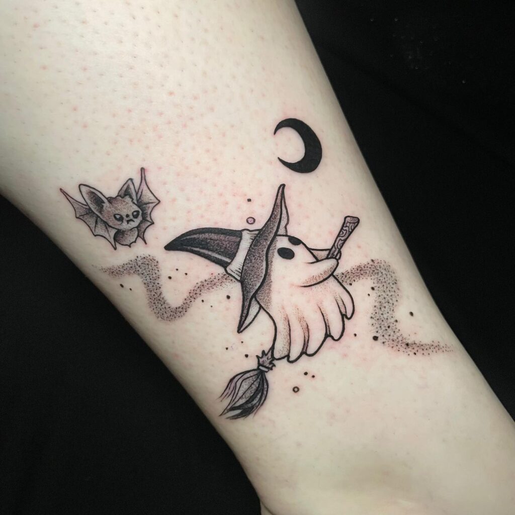 This playful tattoo features a ghost wearing a witch hat, flying on a broomstick with magical charm.