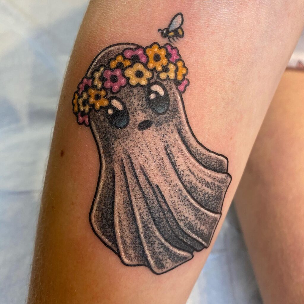 This adorable tattoo features a wide-eyed ghost wearing a colorful crown of flowers across its head. The ghost is shaded in a stippled style, giving its flowing sheet texture and depth.