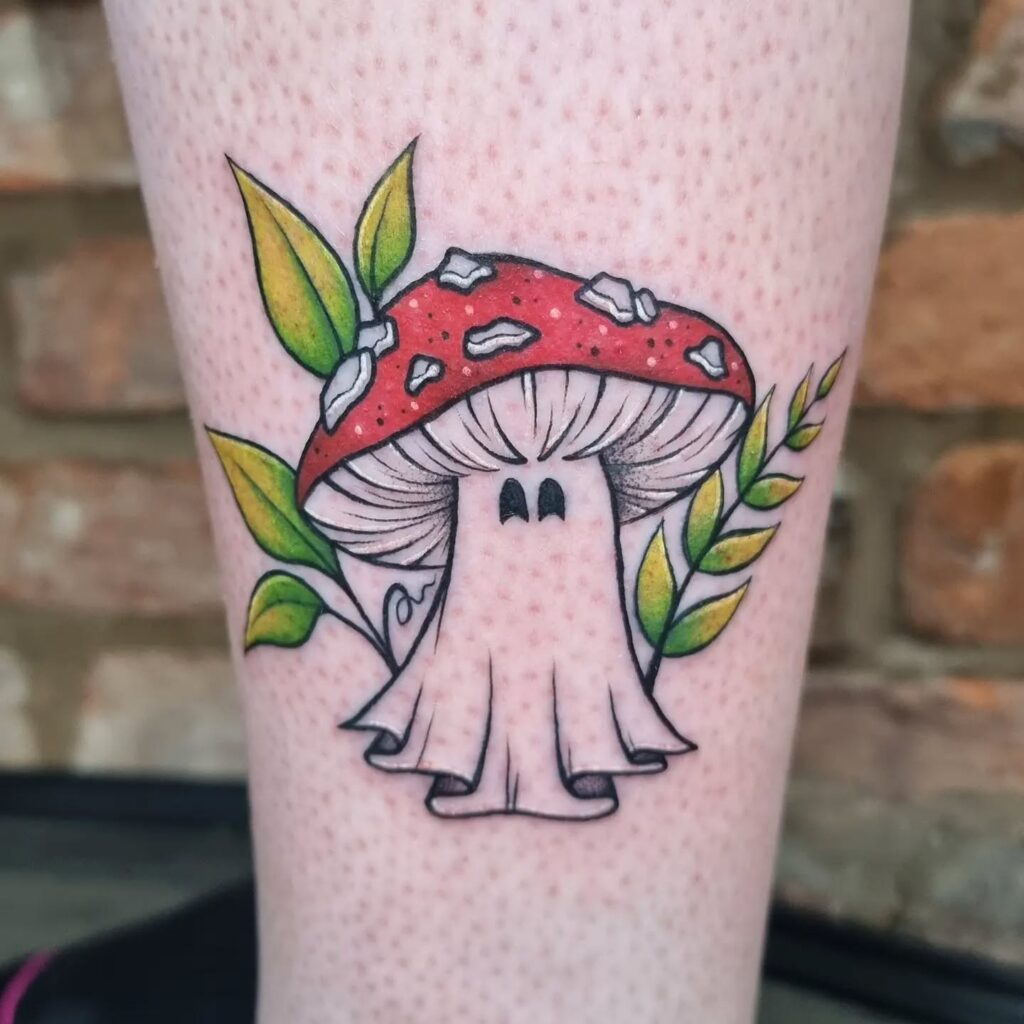 This creative tattoo combines a ghost with a red-capped mushroom, blending spooky and nature-inspired elements beautifully. The ghost’s form flows seamlessly into the mushroom stem, while its dark eyes peek out adorably.