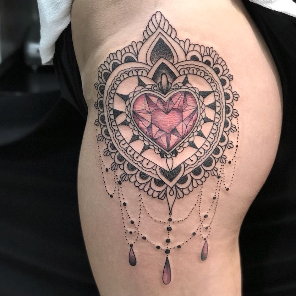 Gem Heart Mandala Hip Tattoo