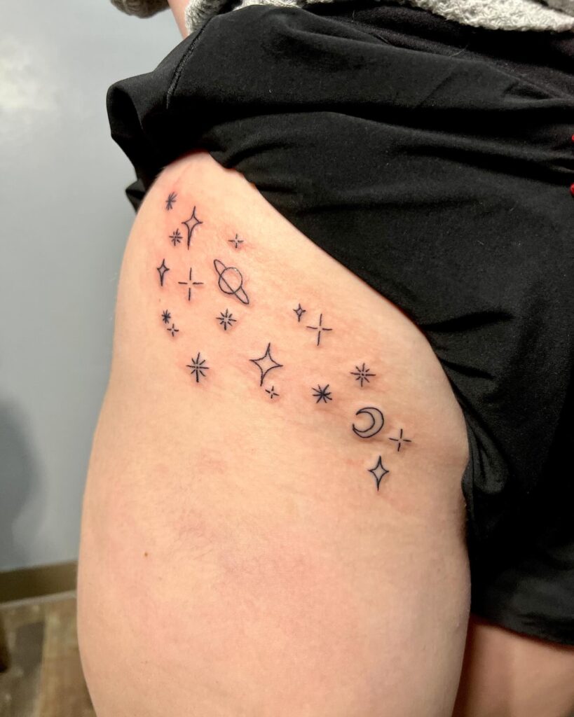 This hip tattoo showcases a graceful constellation of stars, planets, and a crescent moon.