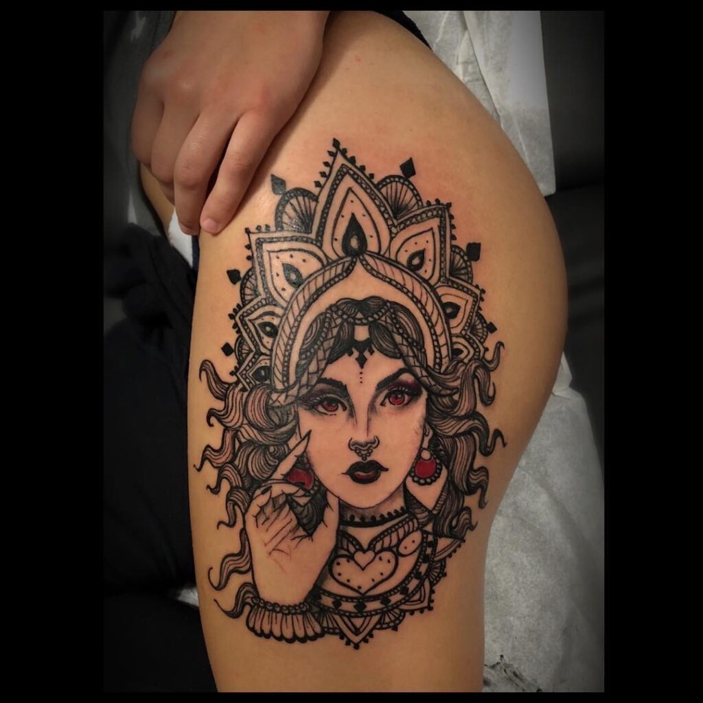 This hip tattoo displays a detailed woman’s portrait framed by an intricate mandala crown and bold black linework.