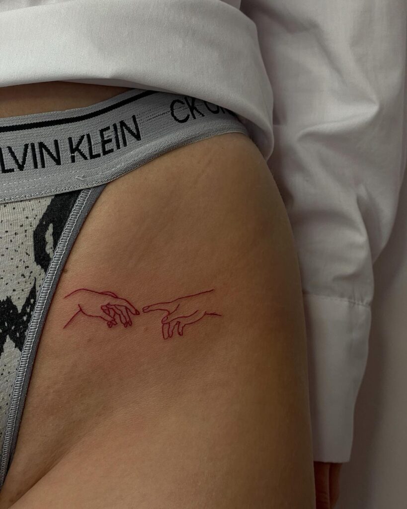 This tattoo shows two hands reaching toward each other, drawn in fine red outlines on the hip.