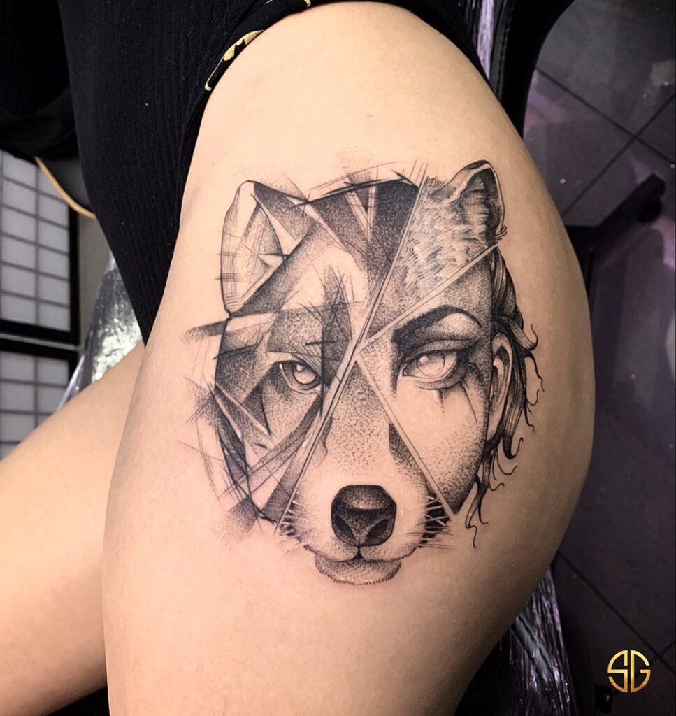 This hip tattoo merges a wolf’s face with a woman’s portrait using sharp geometric lines and dotwork shading.