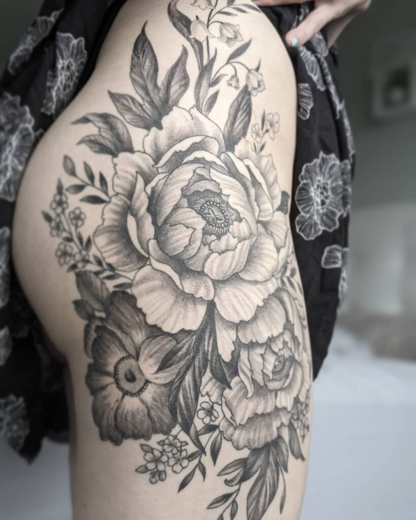 This tattoo features a dramatic bouquet of peonies and assorted blooms stretching across the hip and upper thigh.
