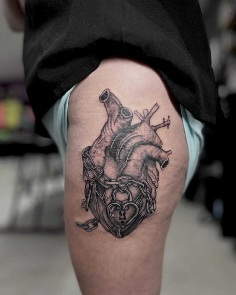 This blackwork hip tattoo presents an anatomically correct heart wrapped in detailed chains and a heart-shaped lock.