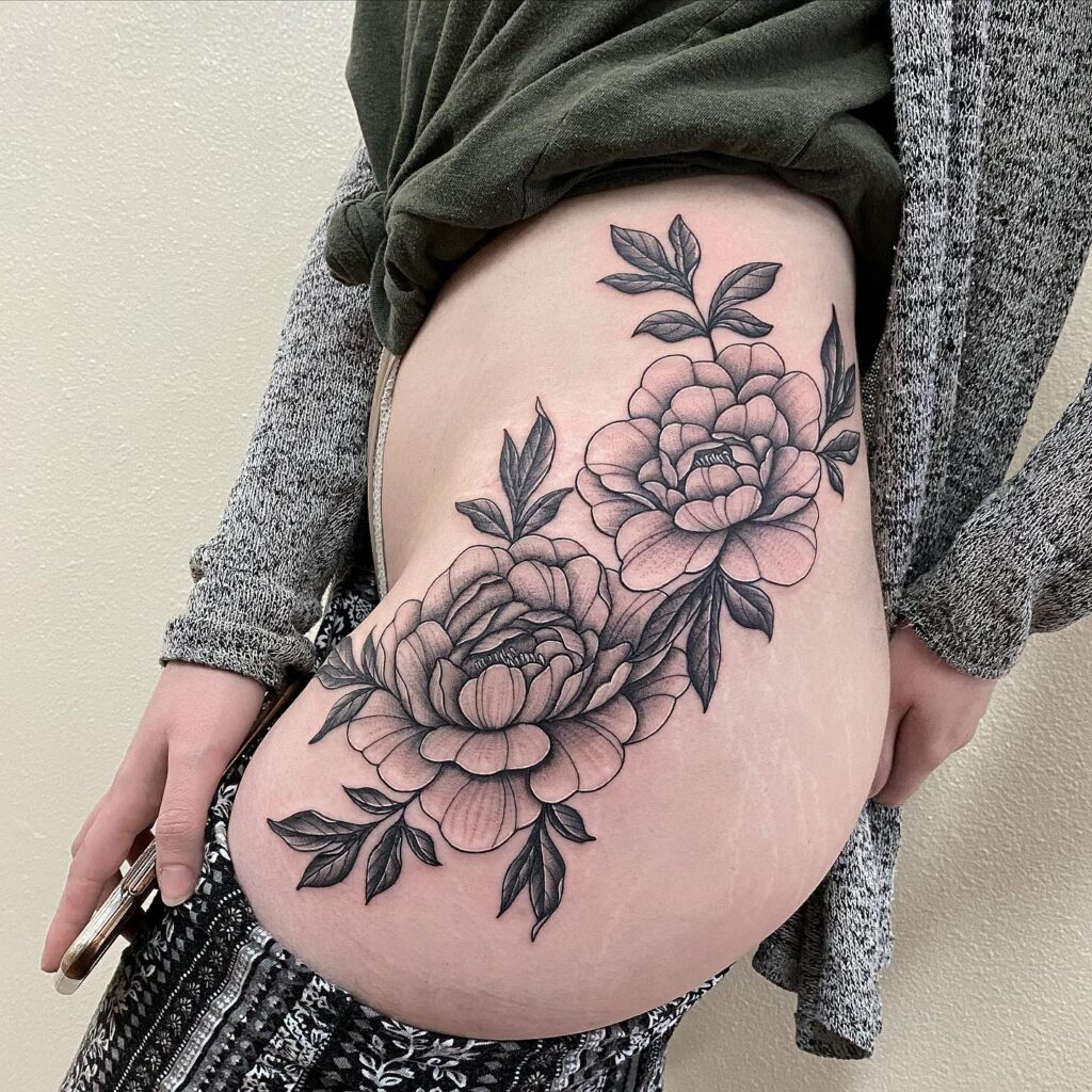 Black and Grey Peony Bouquet Hip Tattoo