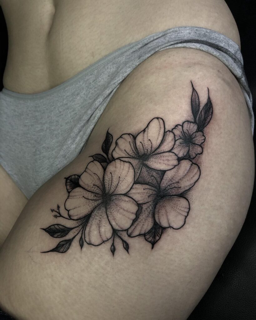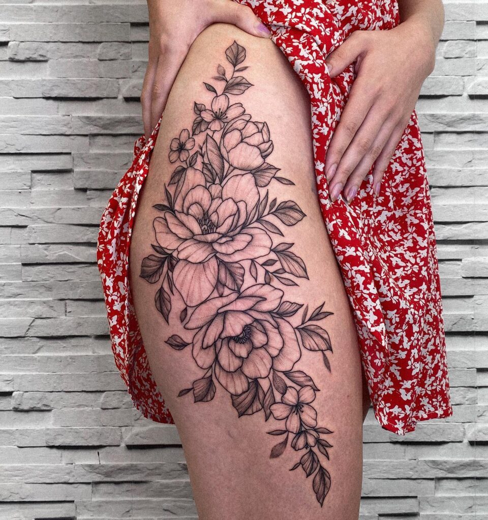 Soft shading brings depth to each petal, while bold outlines define every leaf and stem. The design moves naturally from the upper hip to the thigh, complementing body contours beautifully.