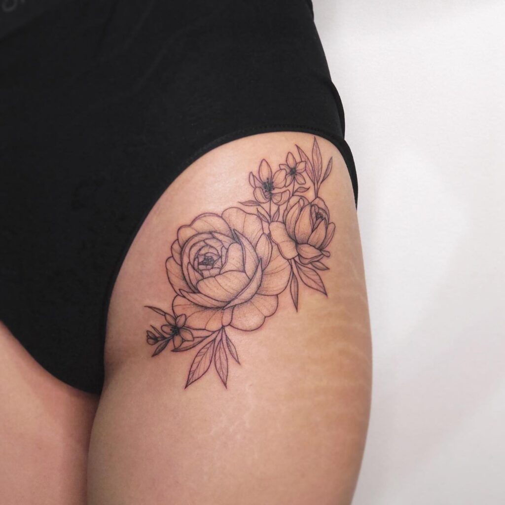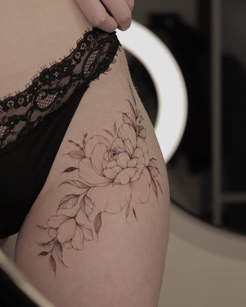 This tattoo shows a graceful cluster of peonies and leaves running along the upper thigh and hip.