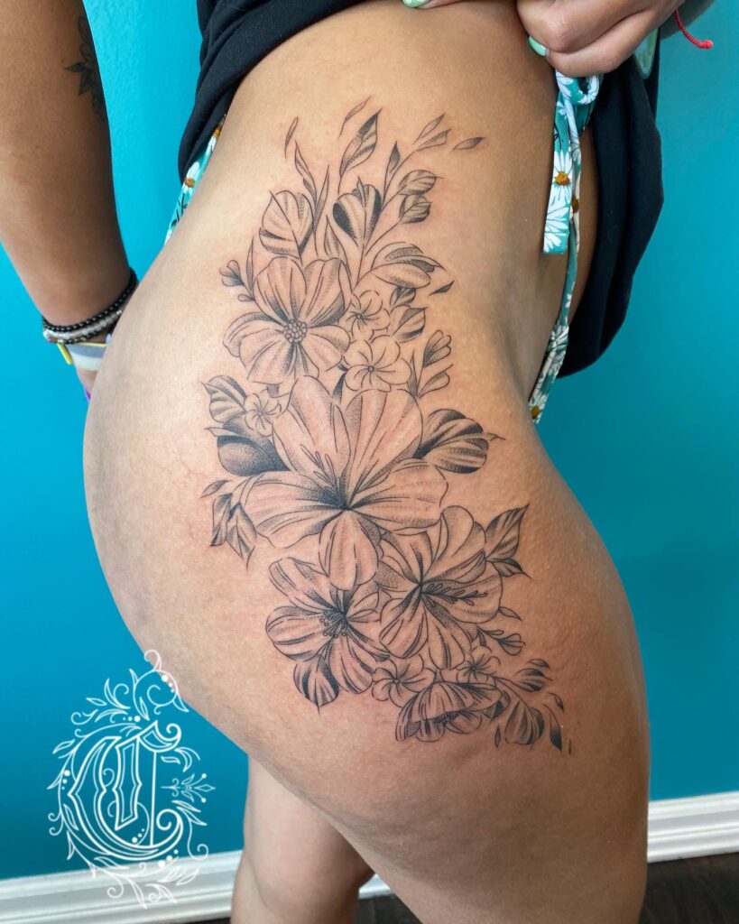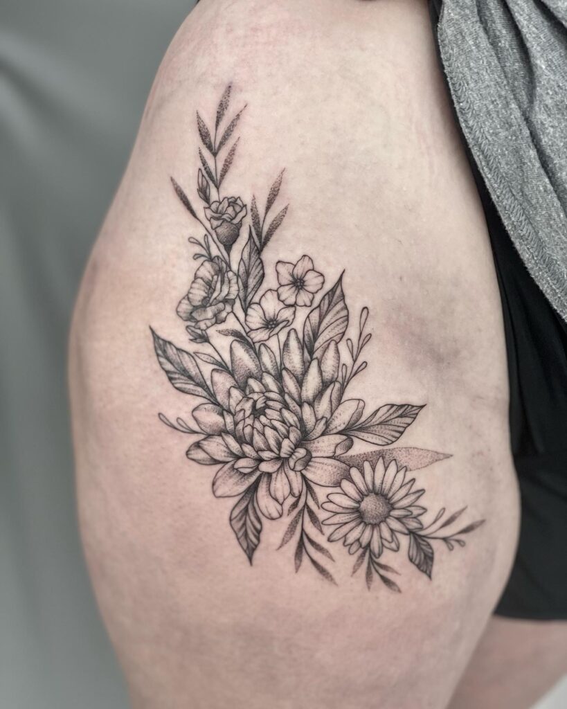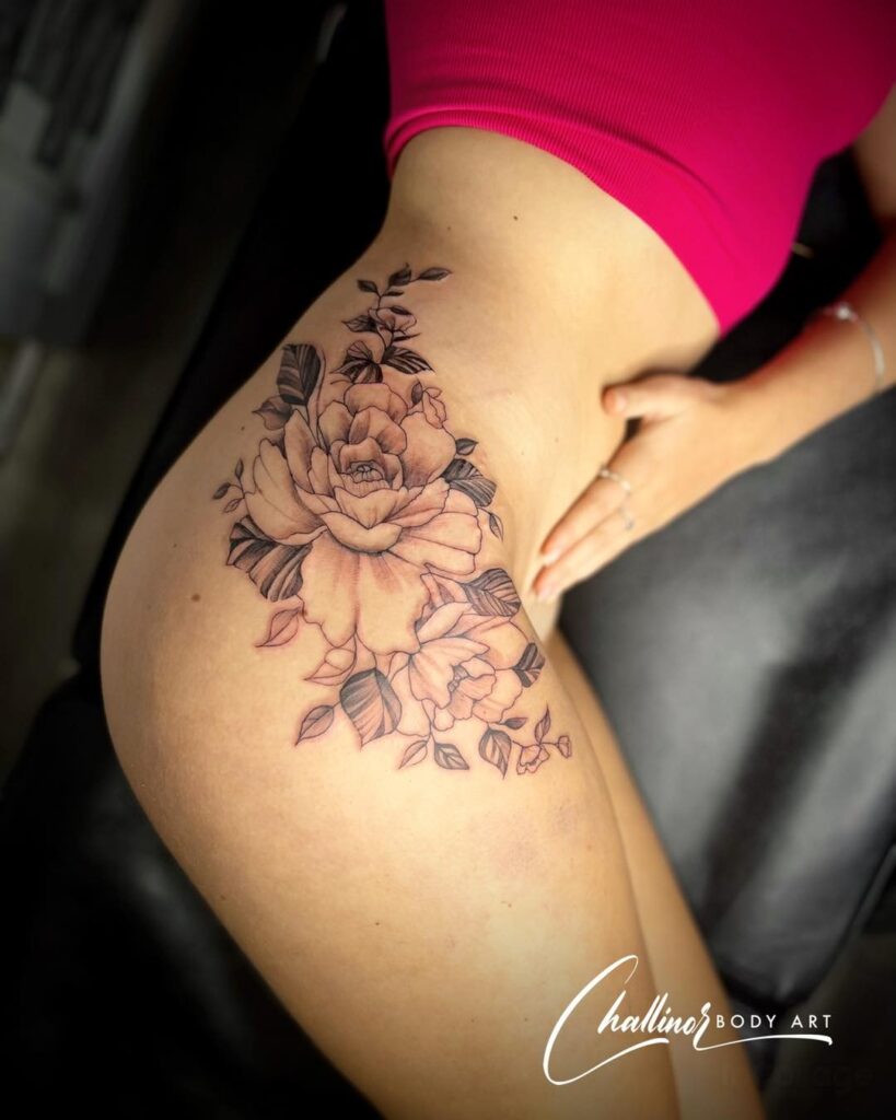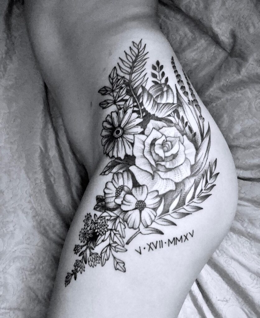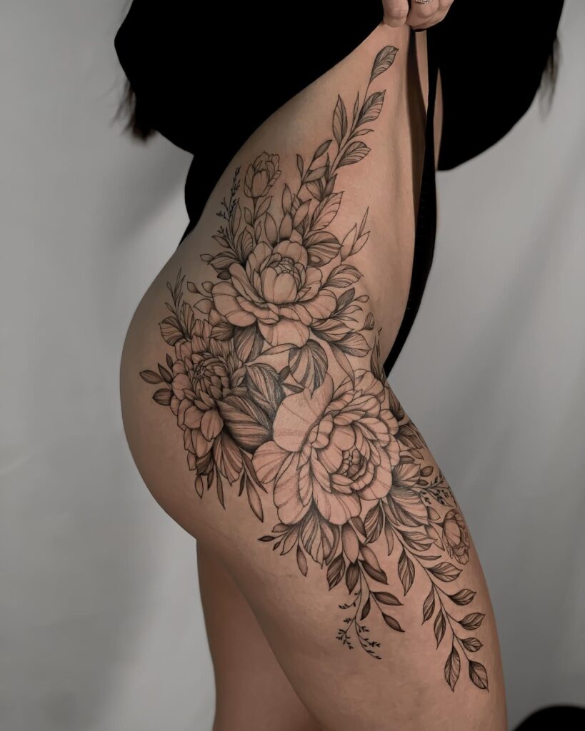 Placed on the hip, the design follows natural curves, making it eye-catching from every angle. This floral arrangement represents beauty and strength, and you can personalize it with colors or keep it black and grey for a timeless, elegant appearance.