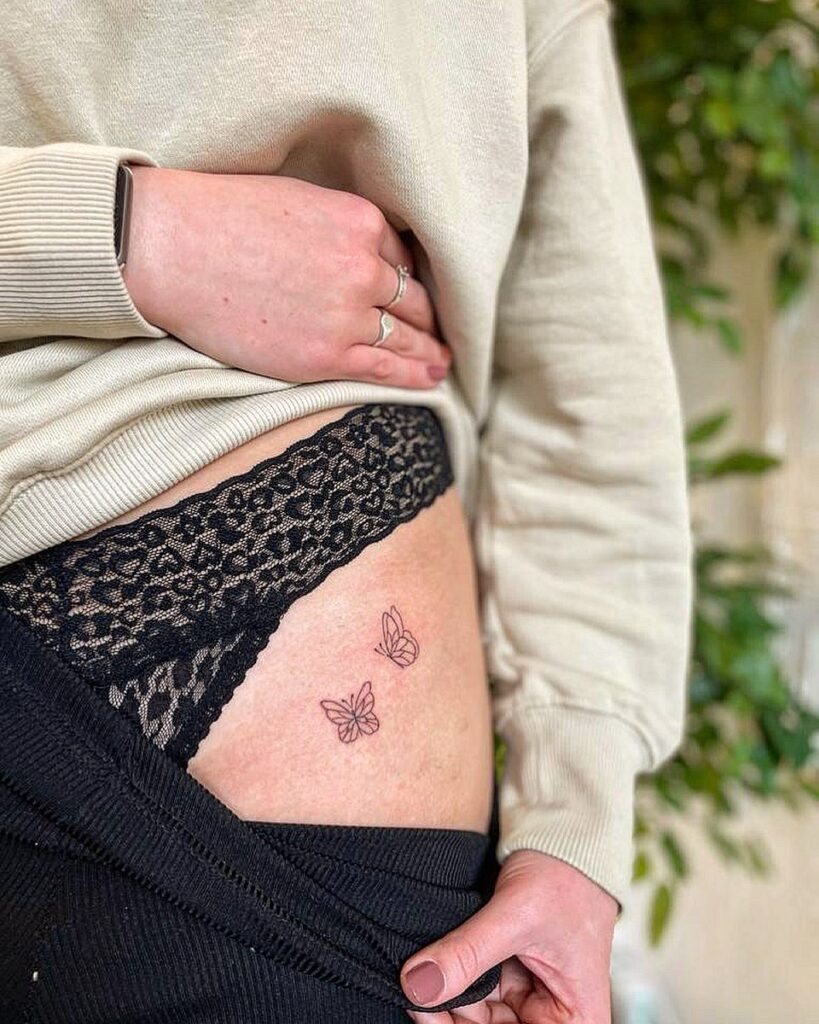 This delicate tattoo features two small butterflies drawn in fine black lines near the hip.