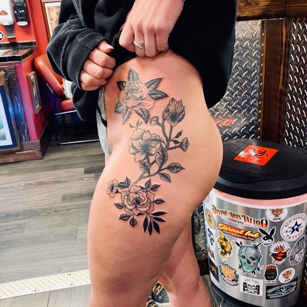 This tattoo spreads a lush arrangement of flowers and leaves across the hip and upper thigh.