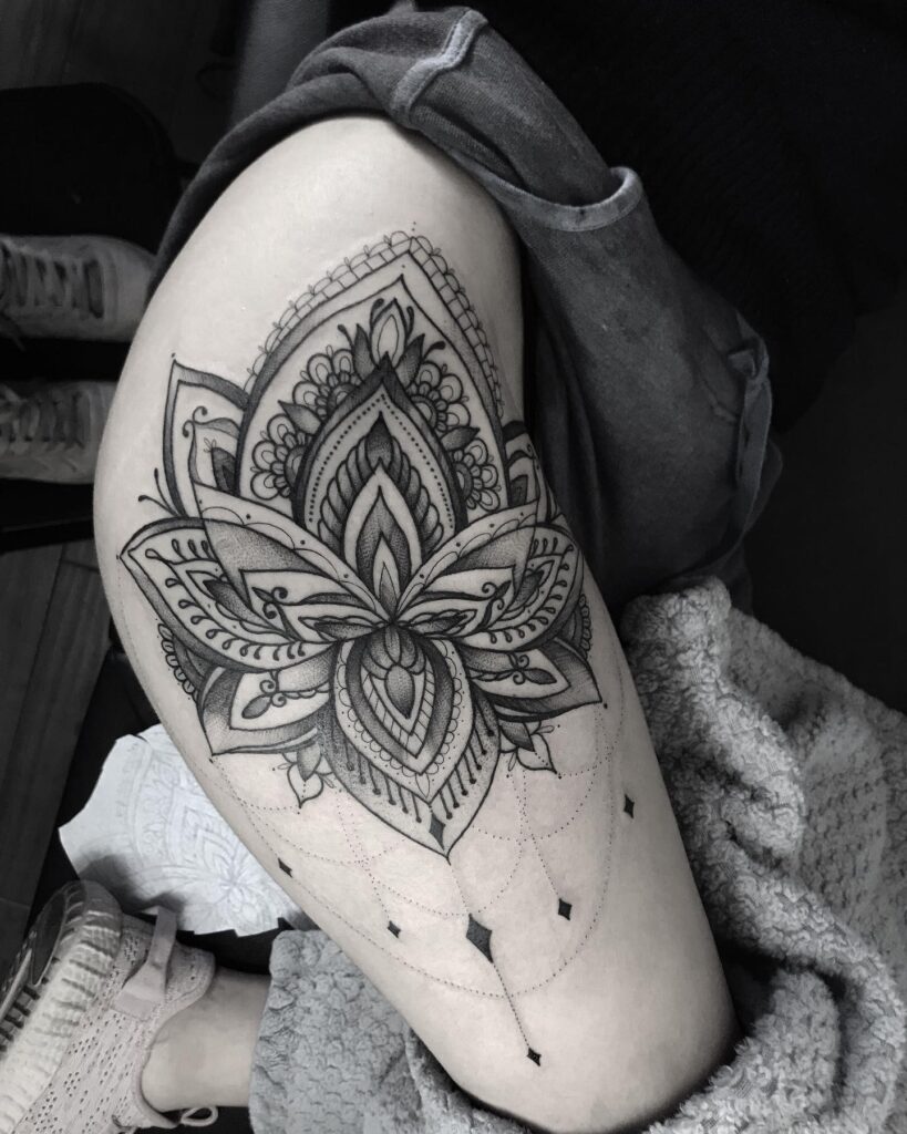 This large mandala flower tattoo flows beautifully across the upper thigh, featuring layered petals and detailed dotwork.