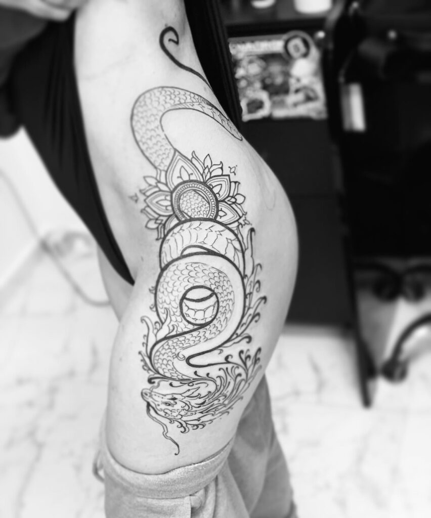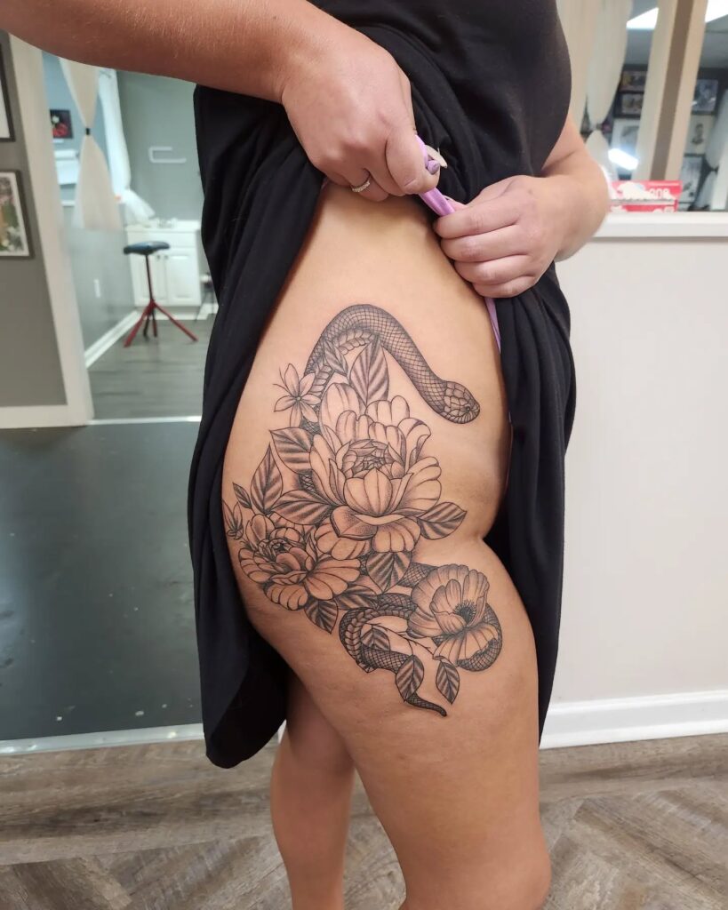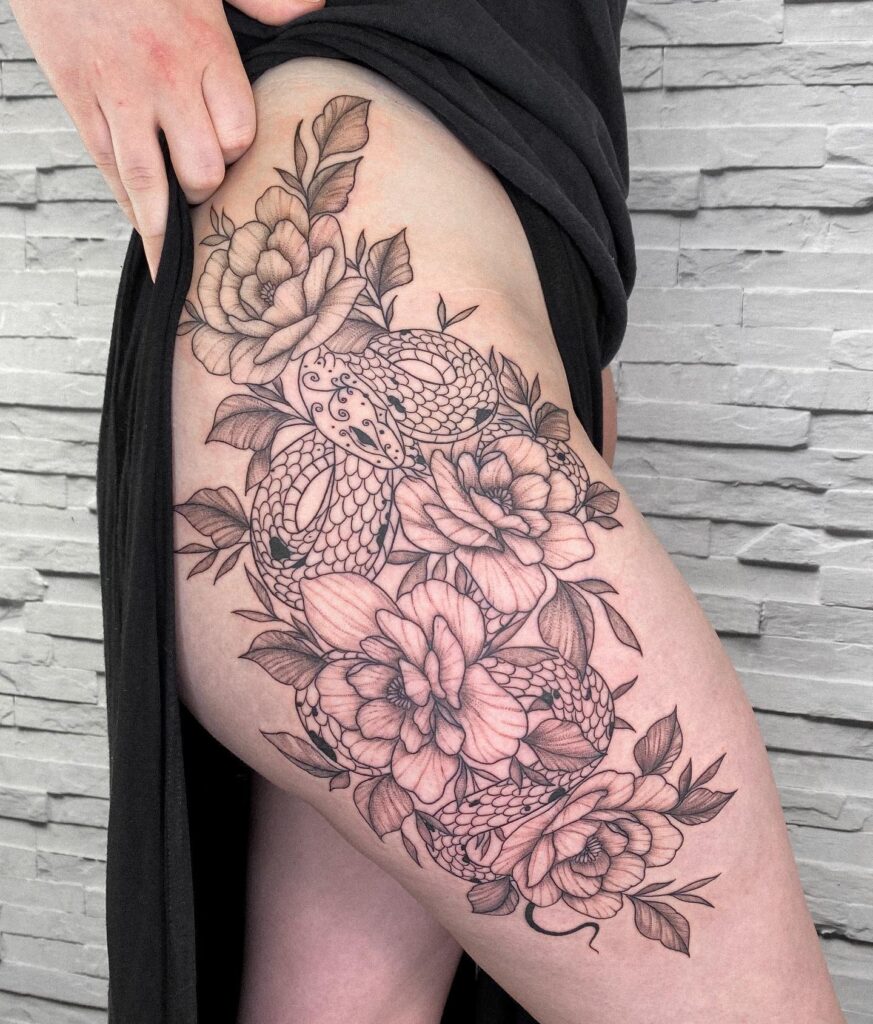 Dark shading and fine linework create striking contrast, highlighting the snake’s scales and the flowers’ layered petals. The natural flow of the design follows the hip and thigh curve, giving it depth and movement.