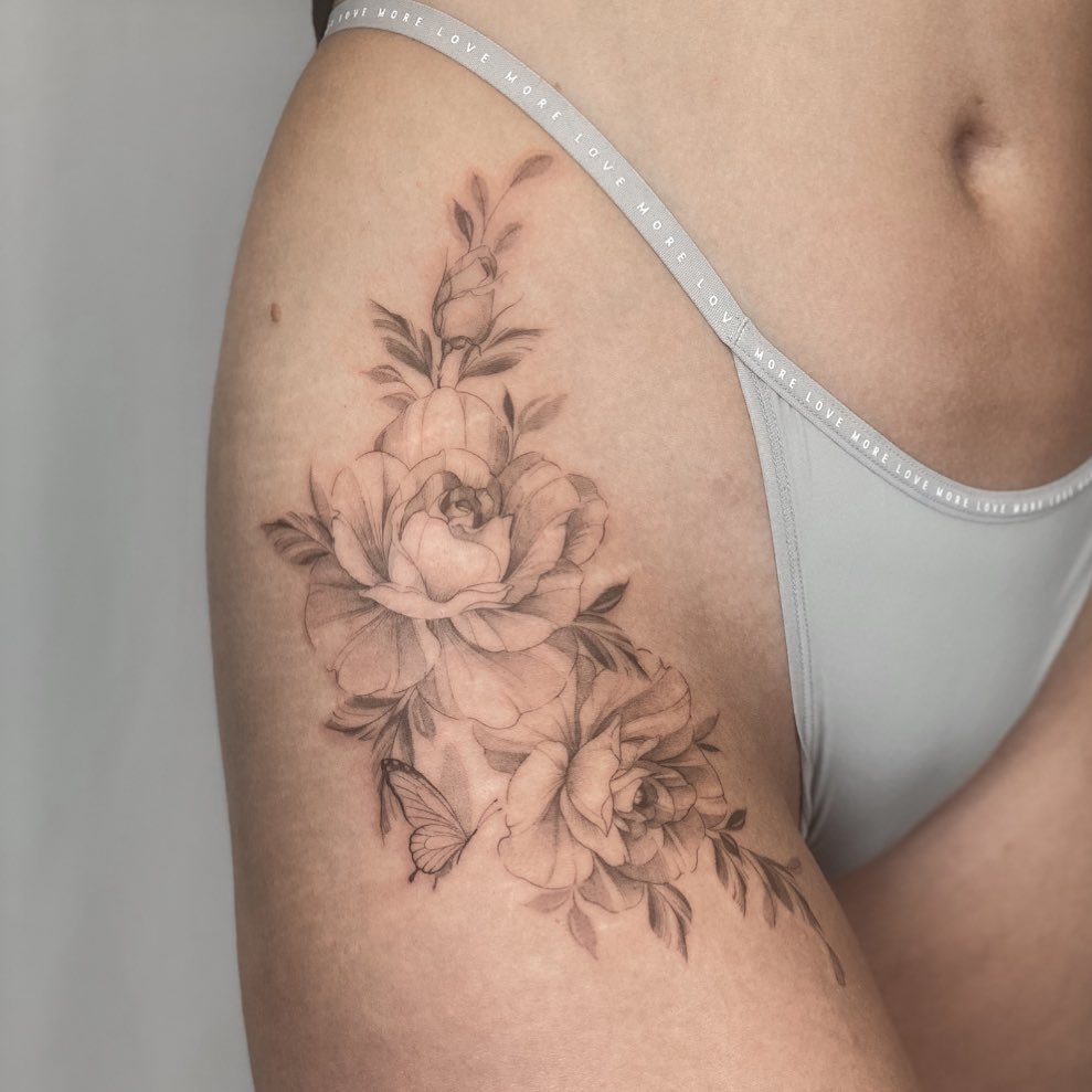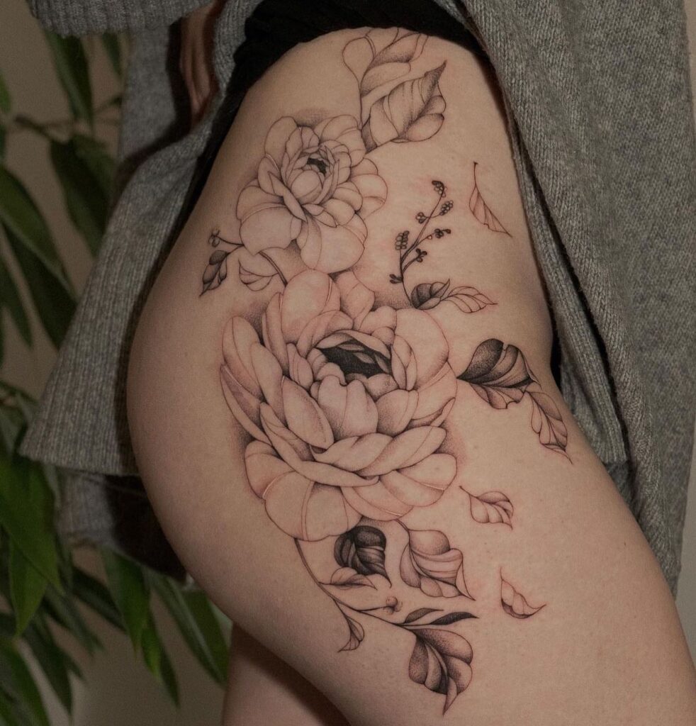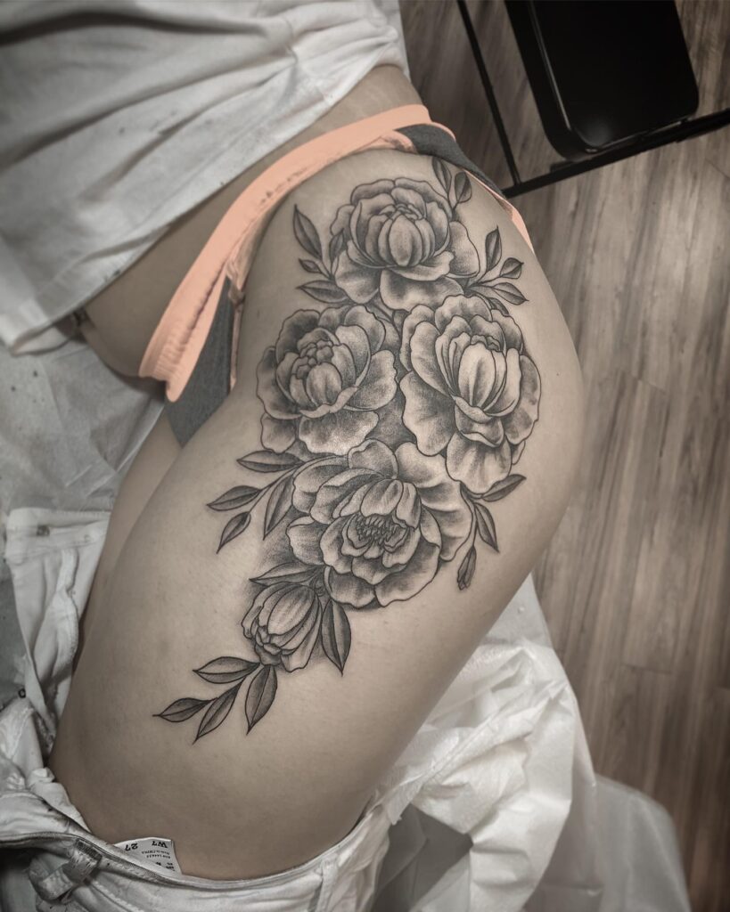 This tattoo shows finely shaded peonies and small buds arranged in a graceful bouquet on the upper hip.