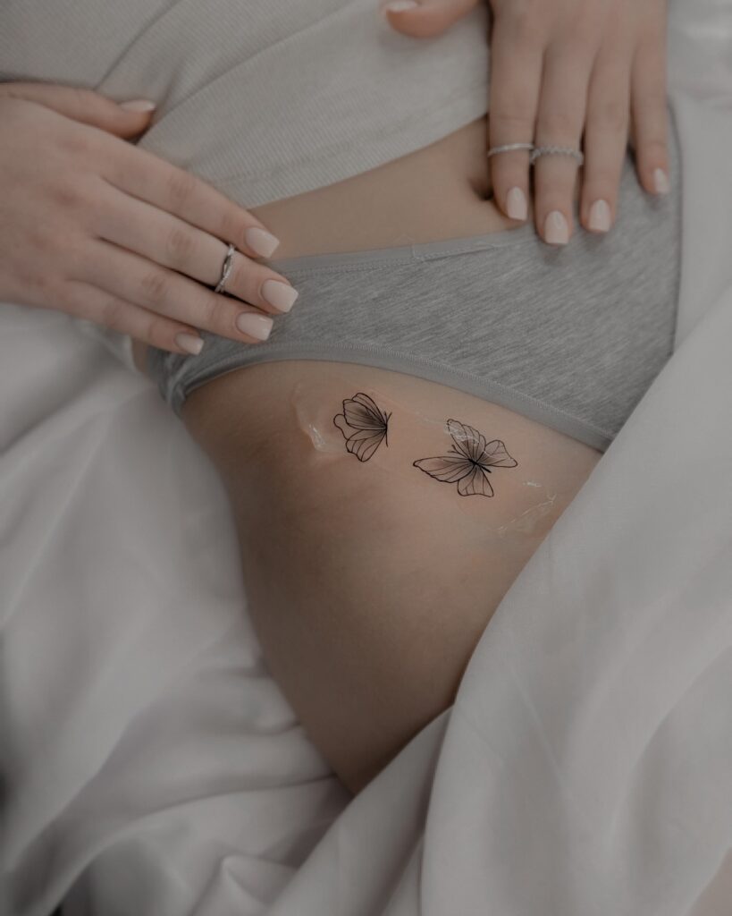 The placement near the bikini line adds a subtle, intimate touch while staying easy to conceal. The paired butterflies suggest movement and freedom, creating a soft and lively design.