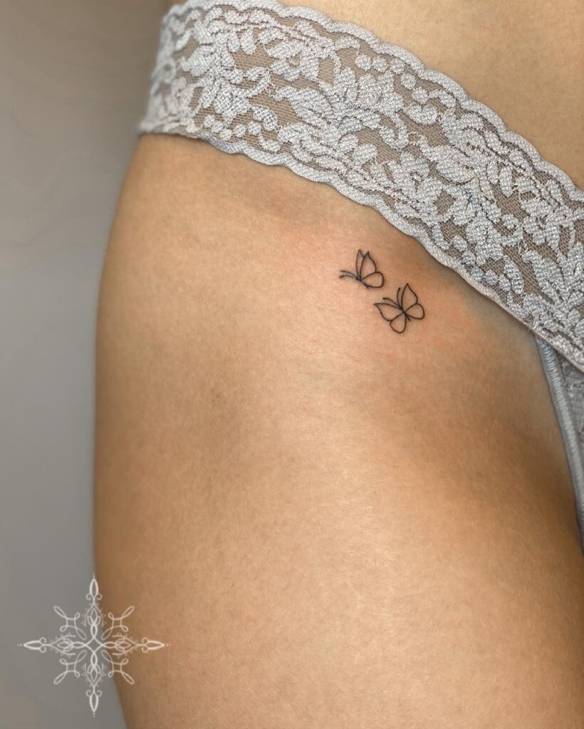 This tattoo features two small butterflies drawn with thin black outlines, placed delicately along the hip.